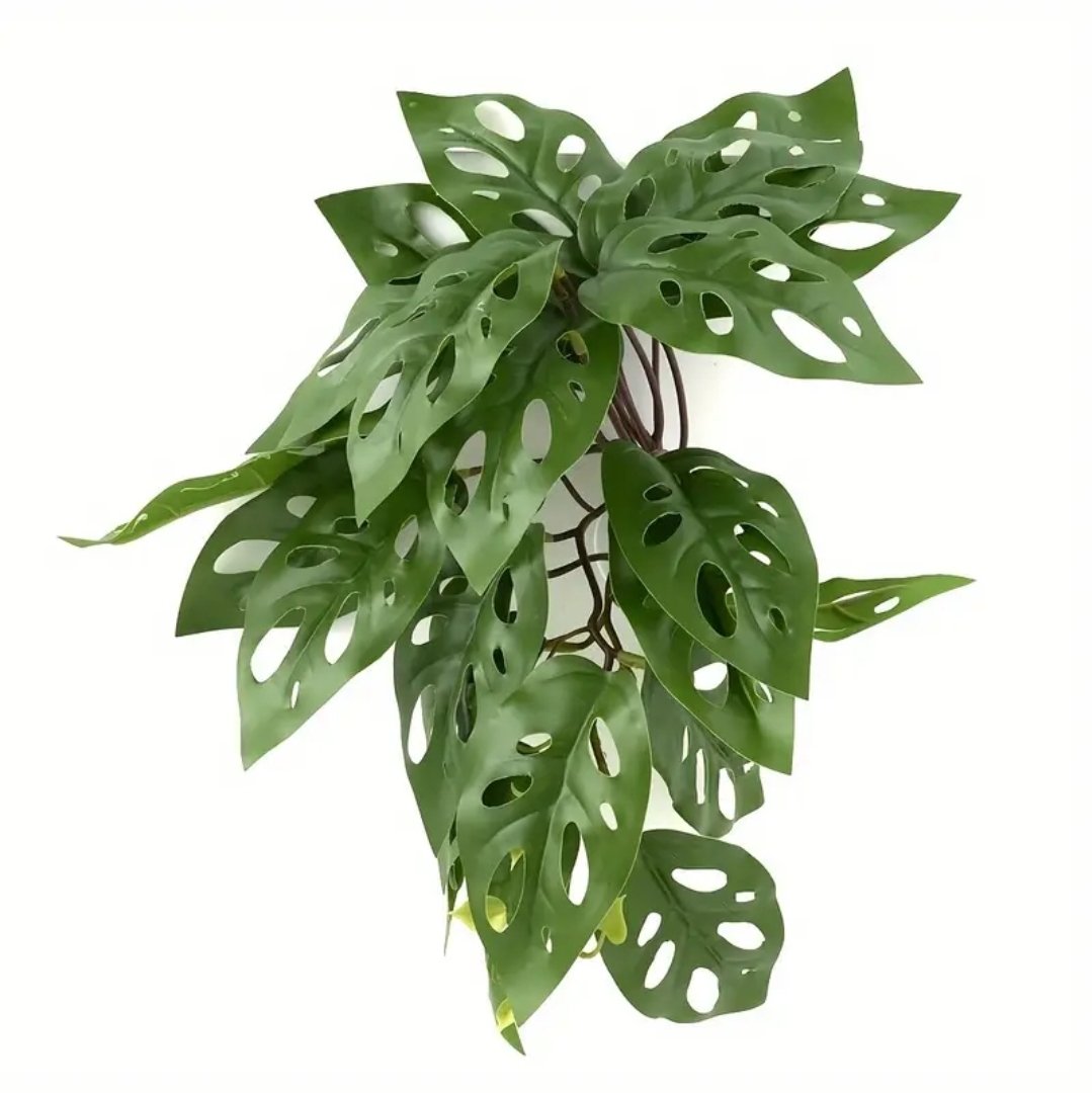 Decora tu terrario con nuestras plantas artificiales colgantes con ventosa, diseñadas especialmente para reptiles, anfibios y geckos crestados. Estas plantas sintéticas realistas imitan a la perfección especies tropicales como la Monstera deliciosa y la Monstera adansonii, aportando un ambiente natural, frondoso y seguro para tus mascotas.